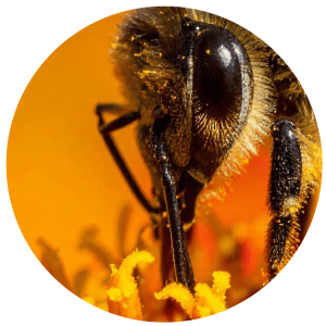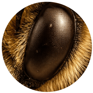 L’abeille possède deux grands yeux composés de milliers de facettes. Cette structure lui permet de détecter les mouvements avec une grande rapidité et de voir les ultraviolets, invisibles pour l’humain, essentiels pour localiser les fleurs.