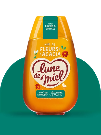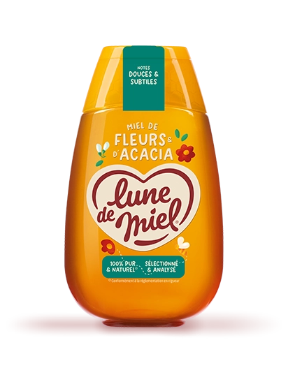 Pensé pour accompagner les petits moments gourmands de la journée, le Miel de Fleurs & d’Acacia Lune de Miel® associe délicatesse de l’acacia et des notes chaudes du miel de fleurs